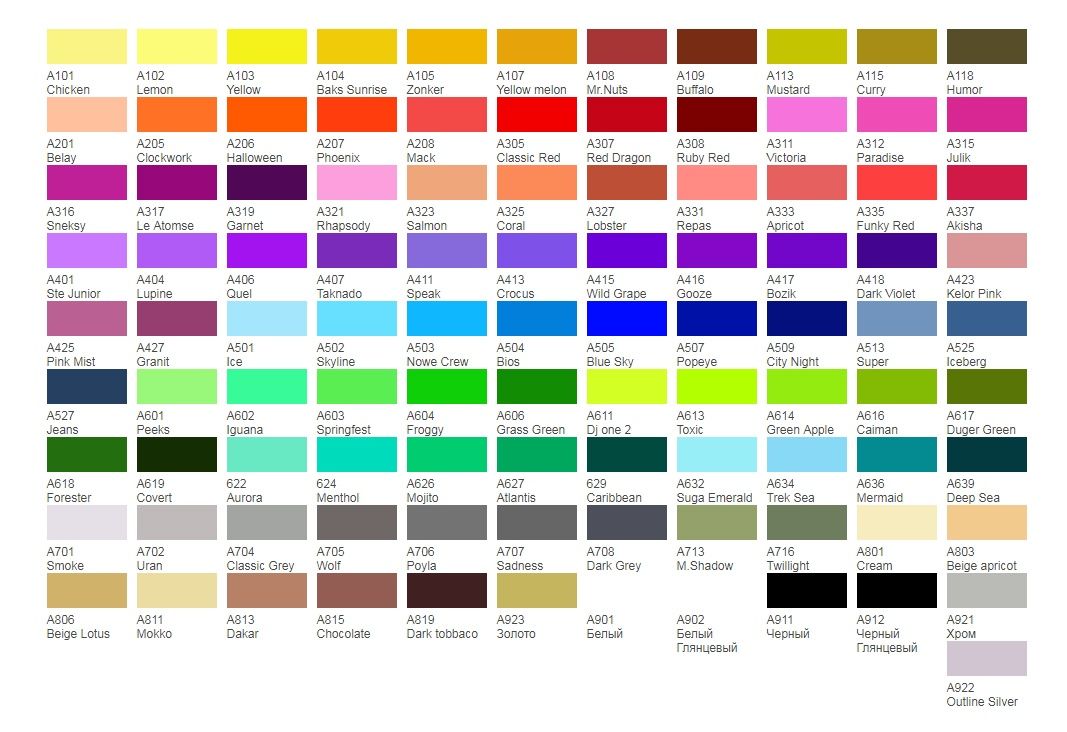 | Названия цветов: | Baby; Bios; Bozik; Buffalo; Chicken; Clockwork Crew; Cornflower; Covert; Crocus; Granit; Iceberg; Jeans; Le Atomse; Mack; Menthol; Mermaid; Military Shadow; Peeks; Phoenix; Pumpkin; Rhapsody; Salmon; Smoothie; Speak; Suga Emerald; Super; Toxic; Vanila; Бежевый Beige Apricot; Бежевый Beige Lotus; Бежевый Dakar; Бежевый Mokko; Белый Super; Белый White; Белый глянцевый White Gloss; Бледно-розовый Kelor Pink; Бронза Bronze; Голубой Blue Sky; Горчичный Mustard; Гранат Garnet; Желтый Baks Sunrise; Желтый DJ one 2; Желтый Yellow Cadmium; Желтый Yellow Melon; Желтый Zonker 207; Зеленая трава Grass Green; Зеленое яблоко Green Apple; Зеленый Cannabis; Зеленый Froggy; Золото Gold; Истинно-зеленый True Green; Коралловый Coral; Коричневый Macadamia; Коричневый Mr. Nuts; Красно-коричневый Horse; Красно-коричневый Ruby Red; Красный Classic Red; Маджента Akisha; Медь Cooper; Ментол White; Мохито Mojito; Небесно-голубой Skyline; Оранжево-красный Funky Red; Оранжевый Halloween; Оранжевый Lobster; Пастельно-оранжевый Belay; Розовый Julik; Розовый Paradise; Розовый Pink Mist; Розовый Princess; Светло-голубой Ice; Светло-зеленый Caterpillar; Светло-розовый Repas; Светло-серый Smoke; Светло-серый Wolf 745; Серо-зеленый Twilight; Серый Asphalt; Серый Classic Grey; Серый Poyla; Серый Sadness 748; Синий City Night; Синий NoWe Crew; Синий Popeye the sailor; Сиреневый Lupine; Телесный Cream 110; Темно-желтый Curry; Темно-зеленый Caribbean; Темно-зеленый Deep Sea; Темно-зеленый Forester 620; Темно-коричневый Dark Tobacco; Темно-красный Red Dragon; Темно-серый Grey dark; Утренняя заря Aurora; Фиолетовый Dark Violet; Фиолетовый Taknado; Фиолетовый Wild Grape; Фуксия Sneksy; Хаки Humor; Хром; Черный Black; Черный глянцевый Black Gloss; Шоколад Chocolate; Ярко-голубой Trek Sea Breez; Ярко-зеленый Atlantis, компьютерная колеровка по согласованию. |