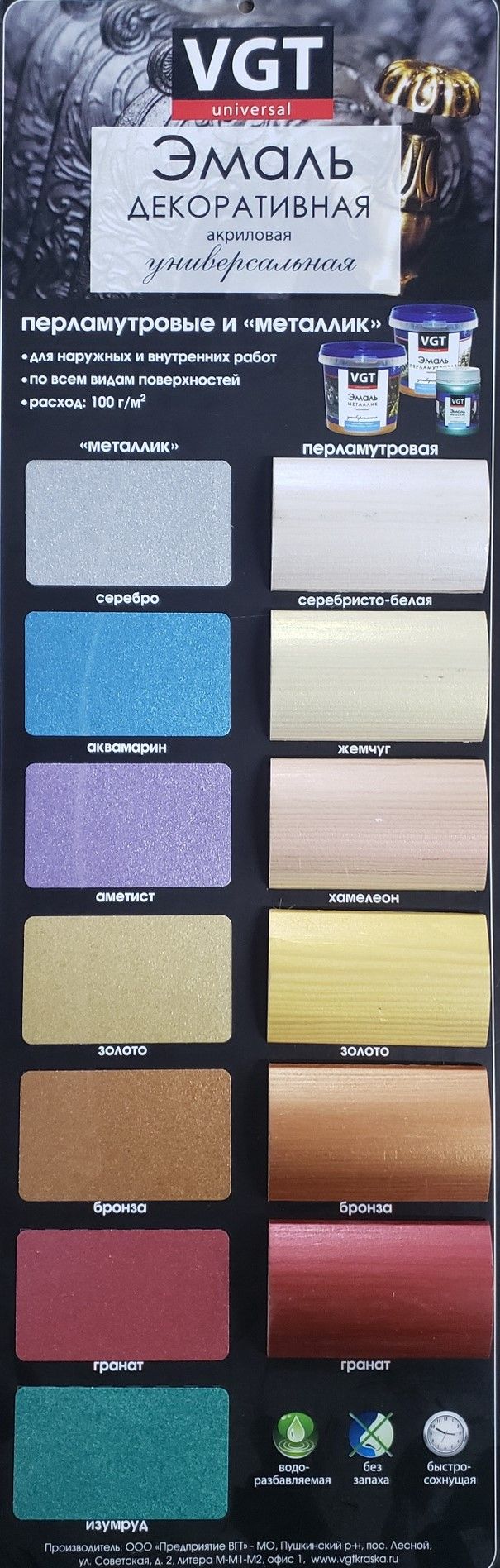 Эмаль перламутровая универсальная ВД-АК-1179 ВГТ  -  Универсальная перламутровая эмаль. Выпускается в нескольких цветах: «золото», «бронза», «серебристо-белая», «гранат», «жемчуг», «хамелеон». Может колероваться высококонцентрированными колеровочными пастами от бренда VGT-ecology material с доставкой по России!