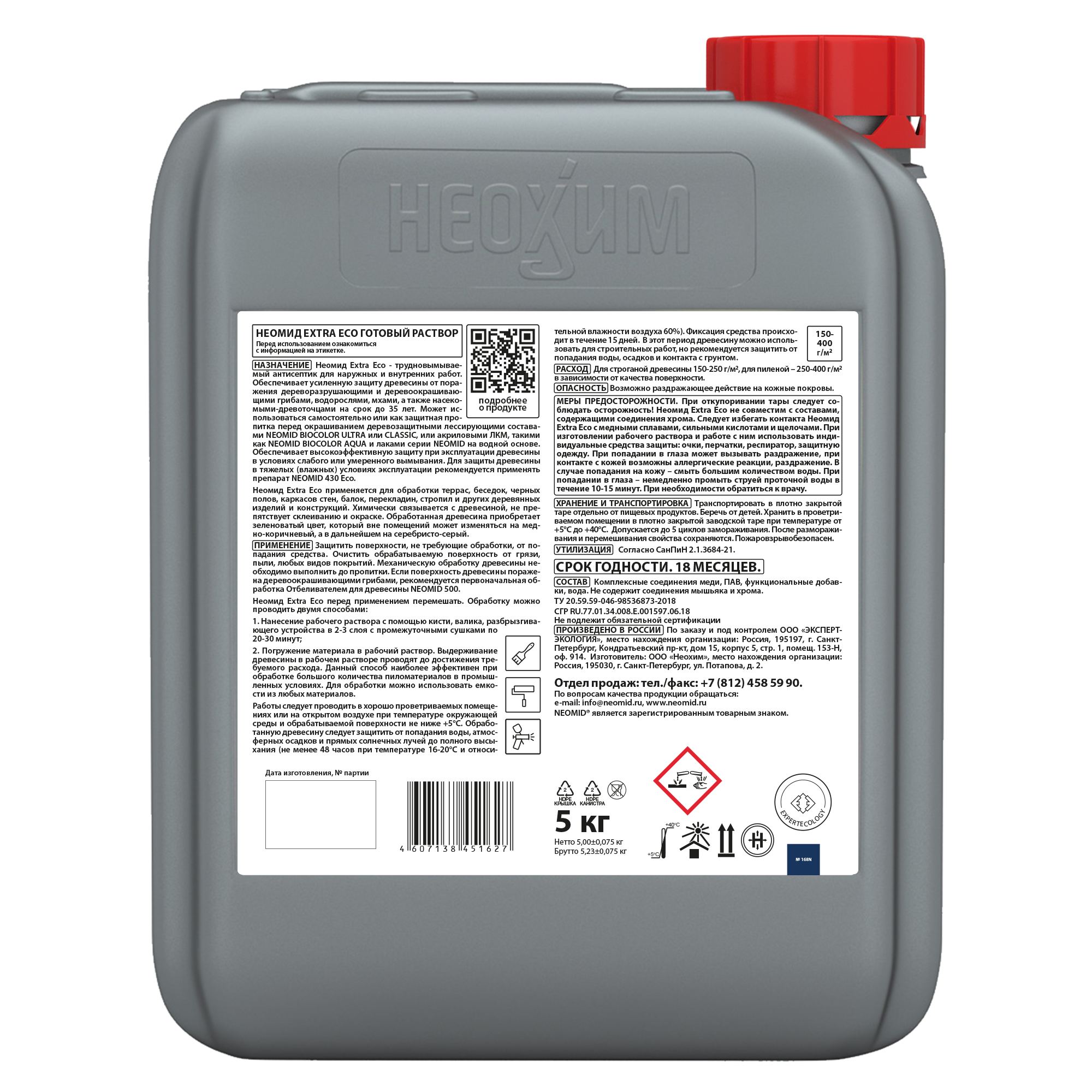 Extra Eco трудновымываемый деревозащитный состав - Трудновымываемый деревозащитный состав. Применяется для обработки террас, беседок, черных полов, каркасов стен, балок, перекладин, стропил и других деревянных изделий и конструкций от бренда Neomid с доставкой по России!