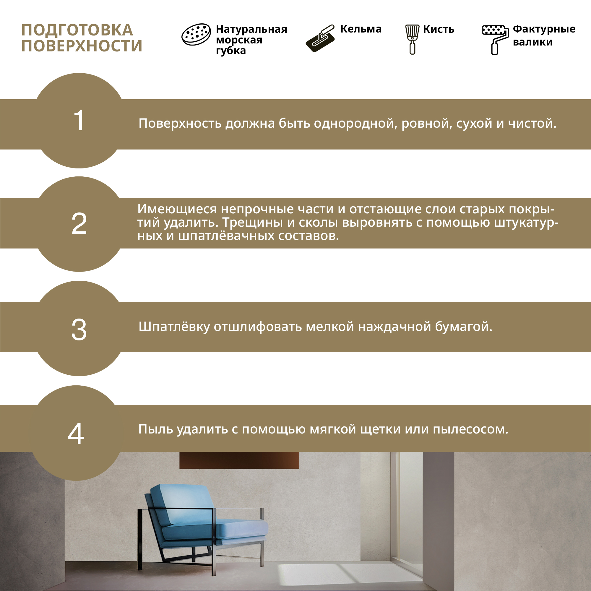 Поверхность должна быть однородной, выровненной, сухой и чистой. Имеющиеся непрочные части и отстающие слои старых покрытий удалить. Трещины и сколы выровнять с помощью штукатурных или шпаклевочных составов. Шпатлевку отшлифовать мелкой наждачной бумагой. Пыль удалить с помощью мягкой щетки или пылесосом.