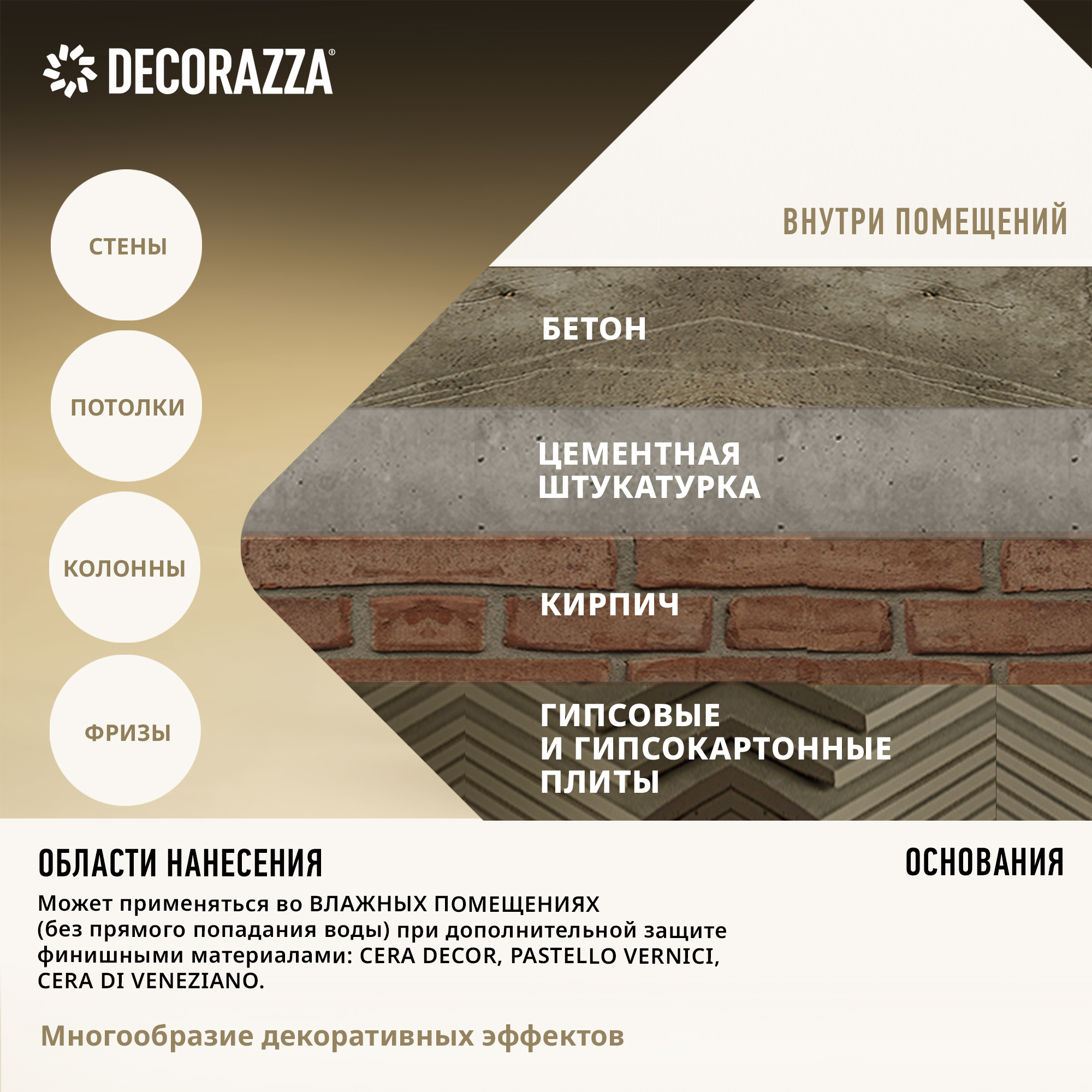Для создания декоративного покрытия без швов и соединений на стенах, потолках, колоннах, фризах и других архитектурных деталях внутри помещений.
