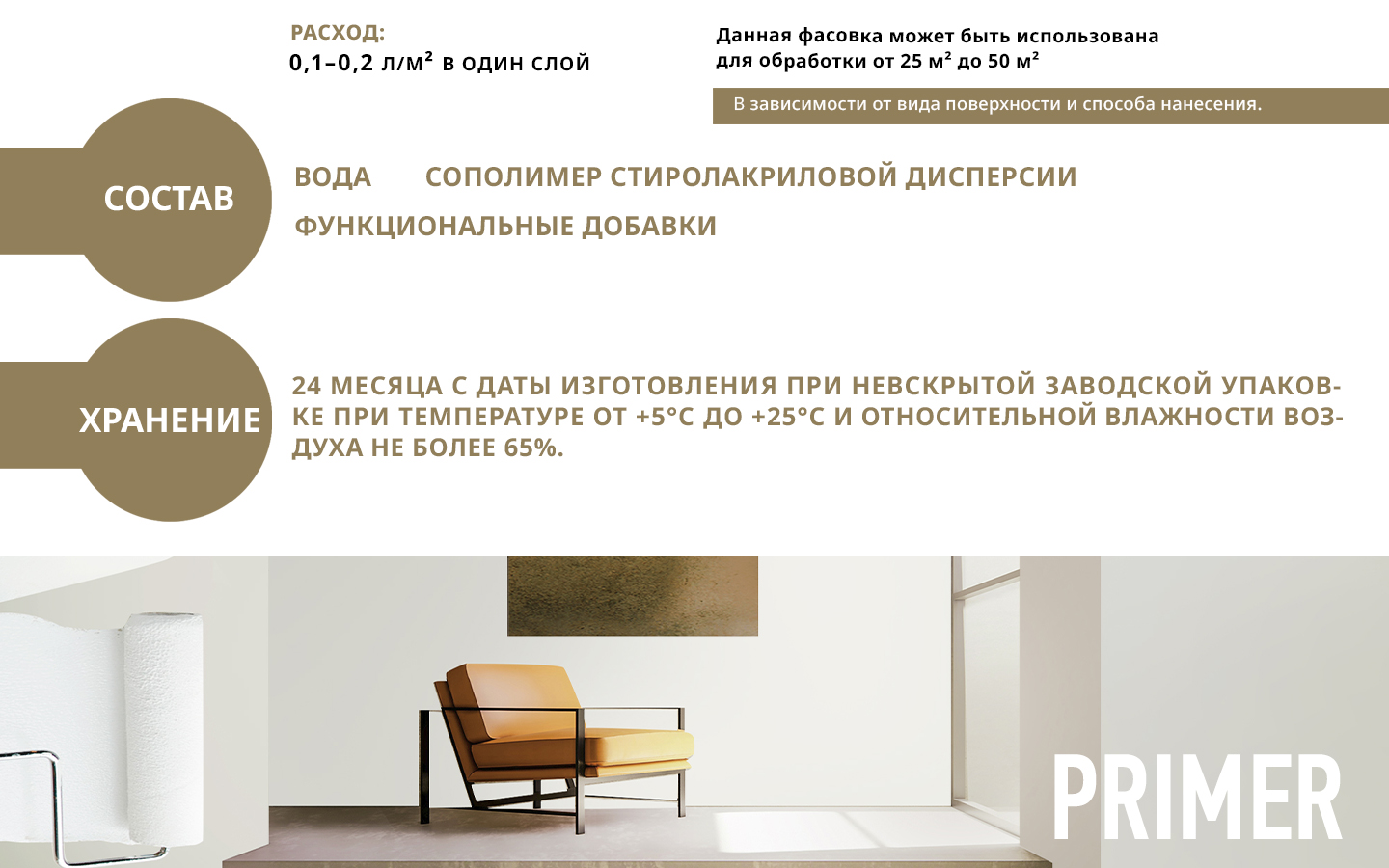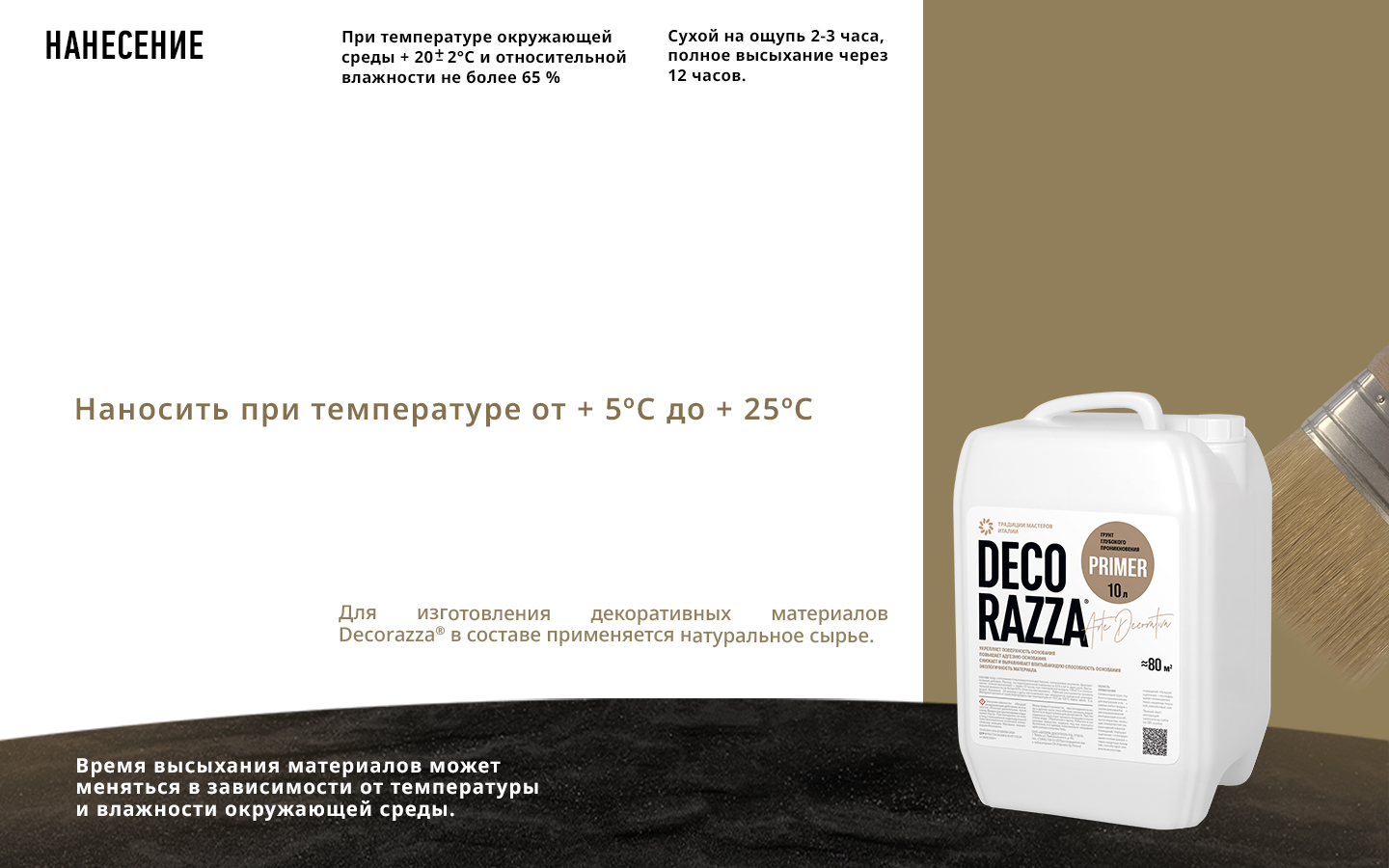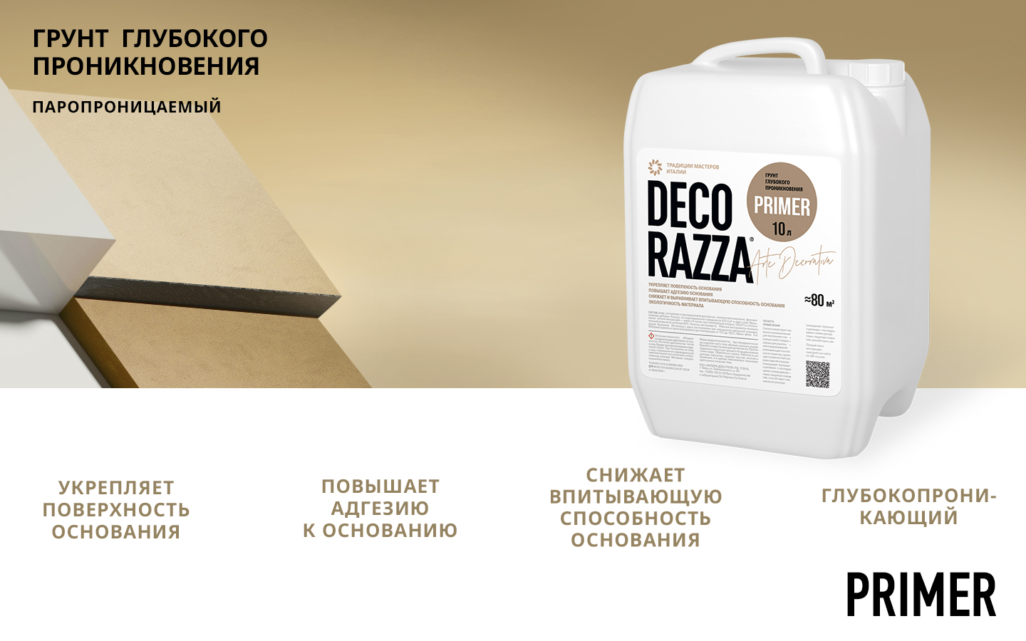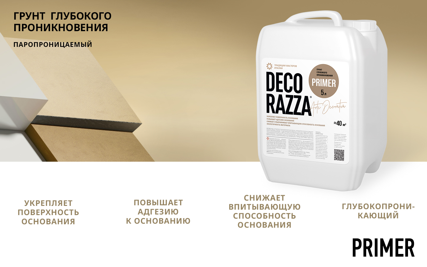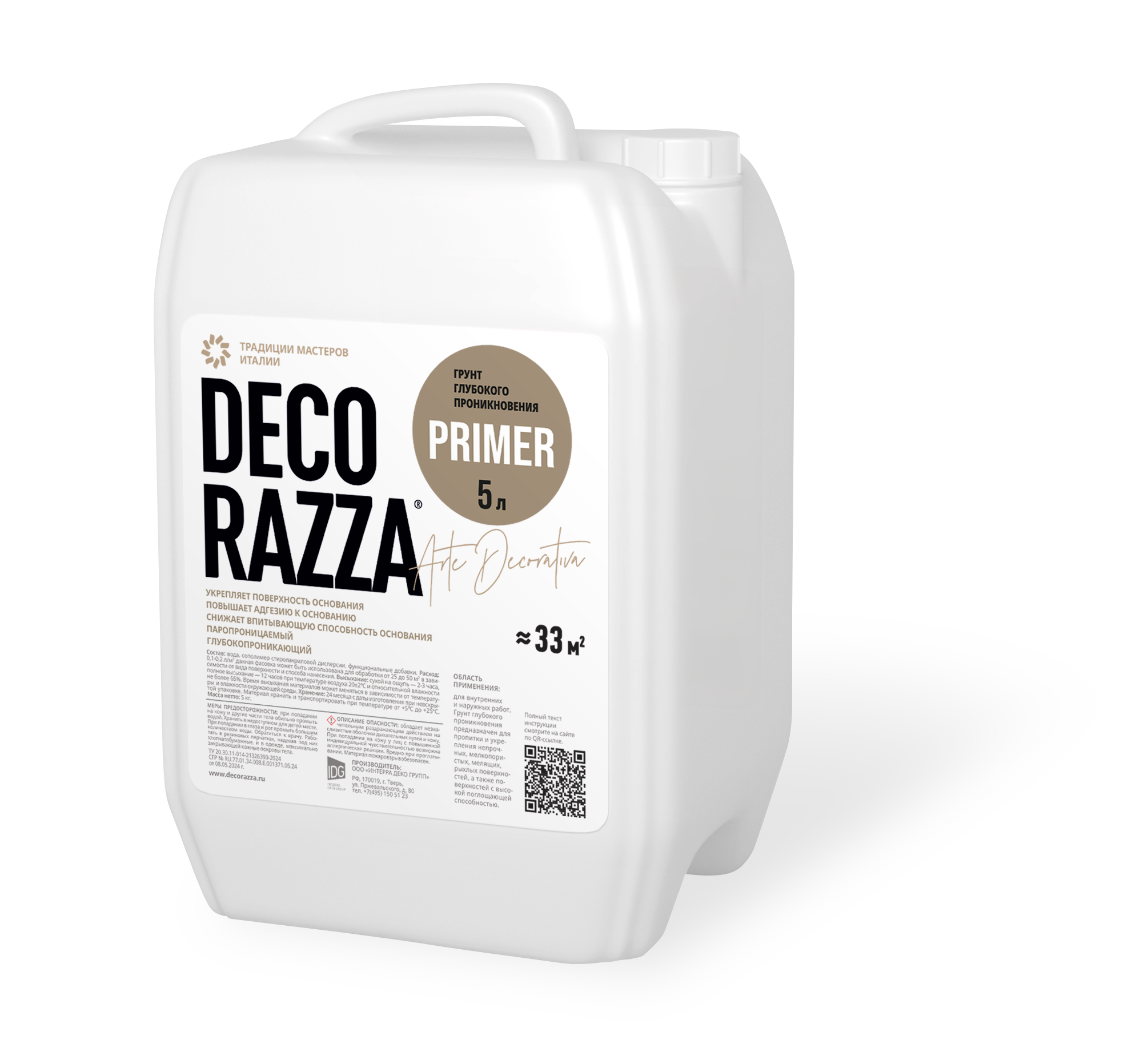 Грунт глубокого проникновения PRIMER - Грунт Decorazza PRIMER — это высококачественная акриловая грунтовка, специально разработанная для минеральных поверхностей, таких как бетон, кирпич и штукатурка. Этот грунт обладает уникальной способностью глубокого проникновения, обеспечивая надежное сцепление с основанием и значительно повышая адгезию декоративной краски или покрытия. Decorazza PRIMER отличается от других грунтов отсутствием неприятного запаха, что делает его идеальным выбором для помещений, где важна комфортная атмосфера. Его укрепляющие свойства обеспечивают долговечность и прочность отделки, делая поверхность устойчивой к механическим воздействиям и погодным условиям. Этот грунт идеально подходит для подготовки основания перед нанесением декоративных покрытий, обеспечивая безупречную гладкость и однородность цвета. Decorazza PRIMER гарантирует качественную основу для любых декоративных работ, делая их долговечными и эстетичными. от бренда Decorazza с доставкой по России!