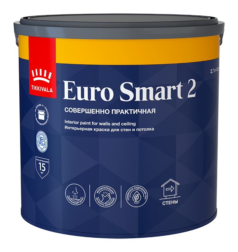 Интерьерная краска EURO SMART 2 (гл/мат)  -  Глубокоматовая водно-дисперсионная краска для окрашивания стен и потолков. Идеальная для быстрого обновления интерьеров. Исключительно легко наносится. Экологичная и безопасная от бренда Tikkurila с доставкой по России!