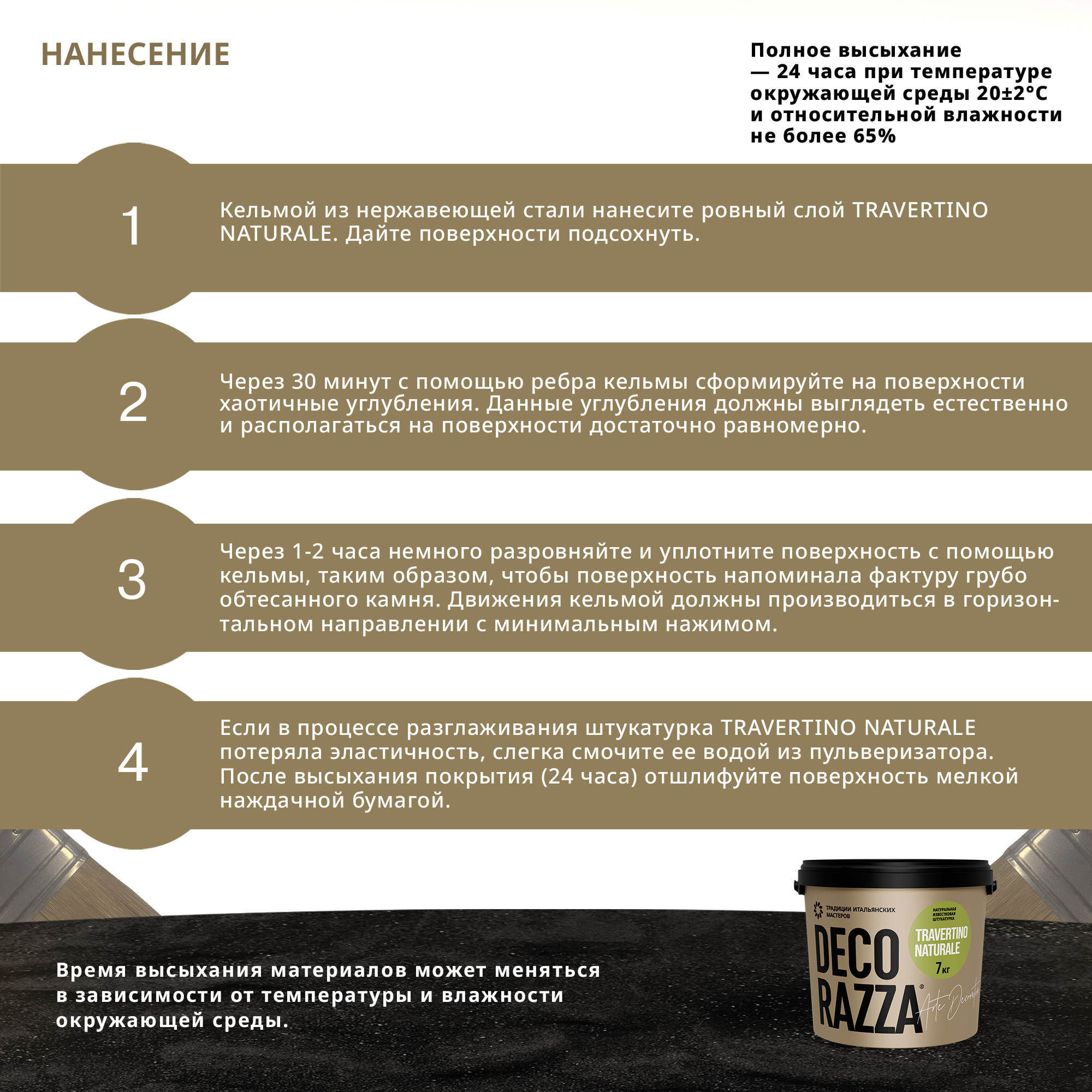1. Перед нанесением Travertino naturale аккуратно перемешать вручную, не перемешивать с помощью дрели, особенно на больших оборотах! Материал готов к применению.