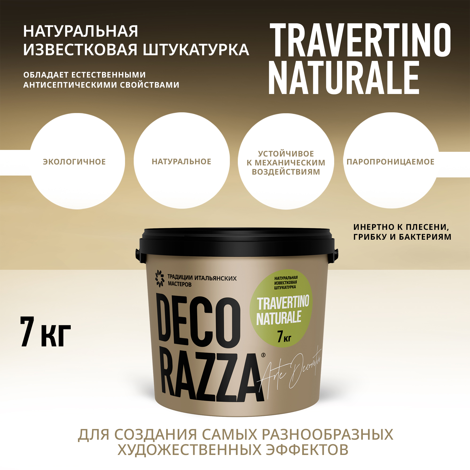 Декоративный материал Travertino Naturale с обновленной формулой уместен в роскошных античных и современных интерьерах с ярко выраженной индивидуальностью. При этом за счет экологичности и антисептических свойств состава, устойчивого к грибку и плесени, он может использоваться в любых помещениях. С помощью известковой штукатурки можно создать эффекты «Камень травертин», «Известняк» и другие.Декоративная штукатурка под кирпич, известняк, песчаник и прочие виды камня эффектно смотрится в сочетании с другими продуктами бренда в интерьерах в античном и скандинавском стиле, хай-теке, минимализме, модерне, эклектике. Известковый материал Travertino Naturale предназначен для отделки стен и потолков внутри помещений для создания паропроницаемого экологичного покрытия, устойчивого к истиранию и защищающего поверхность от появления грибка и плесени. Продукт отличает небольшой расход (1–1,5 кг/м2) и простота нанесения.
