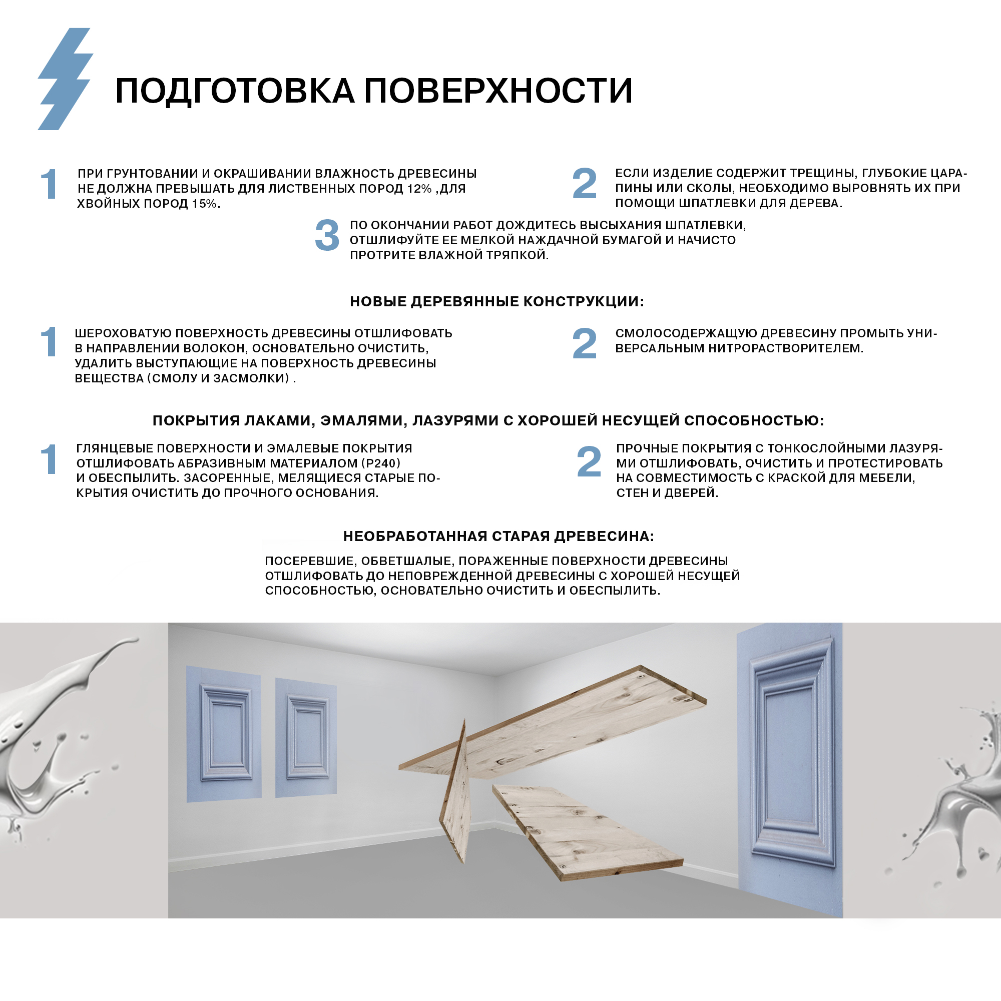 При грунтовании, окрашивании, лакировке влажность древесины не должна превышать для лиственных пород 12% и хвойных пород 15%. Если изделие из дерева содержит трещины, глубокие царапины или сколы, удалить их при помощи шпатлевки для дерева По окончании работ дождитесь высыхания шпатлевки, зашлифуйте ее мелкой наждачной бумагой и начисто протрите влажной тряпкой. Новые деревянные конструкции: Шероховатую поверхность древесины зашлифовать в направлении волокон, основательно очистить, удалить выступающие на поверхность древесины вещества (смолу и засмолки). Смолосодержащую древесину перед лакированием промыть универсальным нитрорастворителем. Покрытия лаками, эмалями, лазурями с хорошей несущей способностью: Глянцевые поверхности и эмалевые покрытия зашлифовать абразивным материалов (Р240) и обеспылить. Засоренные, мелящиеся старые покрытия очистить до прочного основания. Прочные покрытия с тонкослойными лазурями зашлифовать, очистить и протестировать на совместимость с краской для мебели, стен и дверей. Необработанная старая древесина: Посеревшие, обветшалые, пораженные поверхности древесины отшлифовать до неповрежденной древесины с хорошей несущей способностью, основательно очистить и обеспылить.