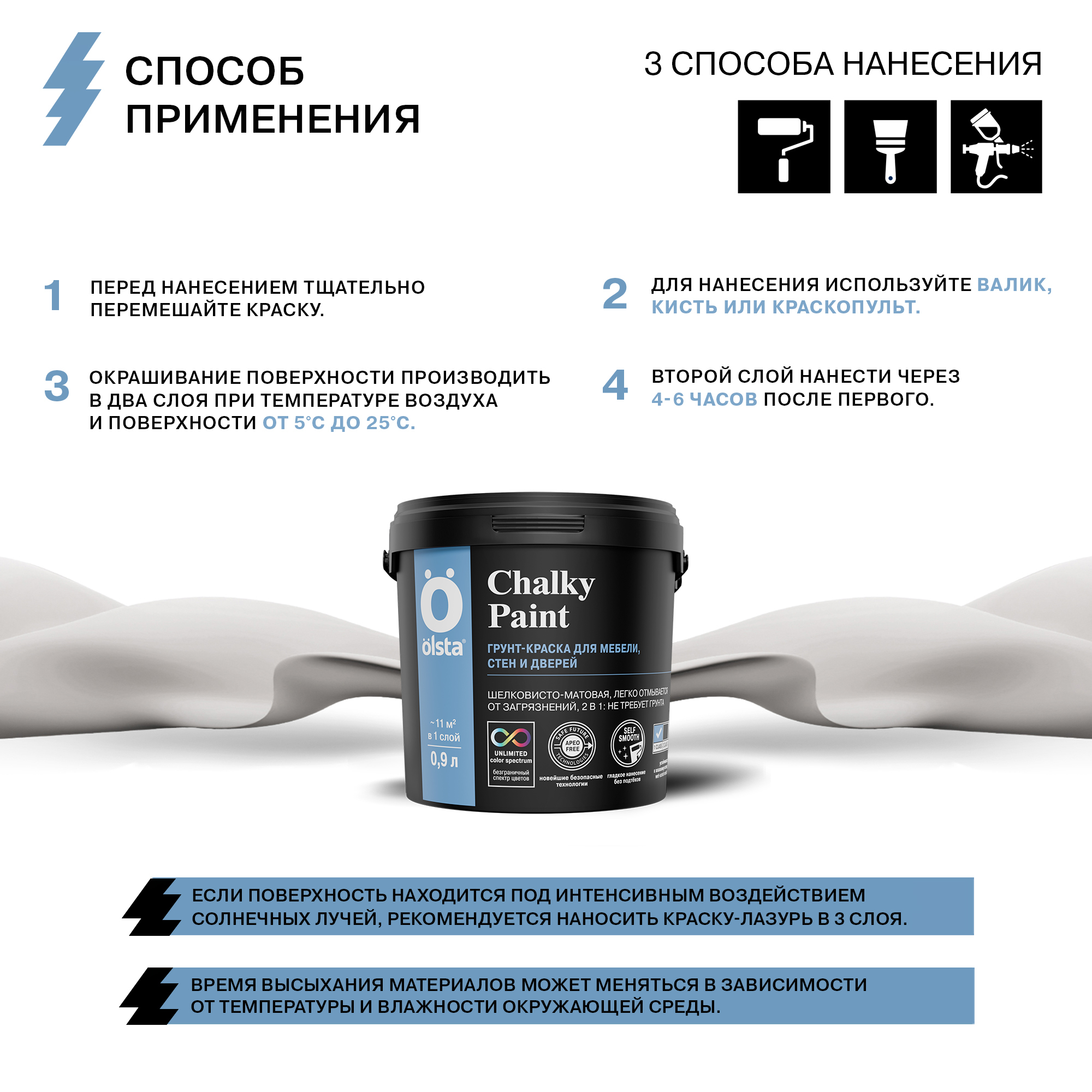 Краска для мебели меловая CHALKY PAINT  -  Краска для мебели меловая OLSTA CHALKY PAINT — это непревзойденное решение для тех, кто мечтает о стильной и долговечной мебели без лишних хлопот. Эта мебельная краска обладает уникальной матовой текстурой, напоминающей натуральный мел, что придает поверхности уютный и элегантный вид. Экологичная формула на водной основе гарантирует отсутствие неприятного запаха, делая процесс окрашивания комфортным как для вас, так и для вашего дома. OLSTA CHALKY PAINT отличается своей стойкостью к износу, обеспечивая долгие годы безупречного вида вашей мебели. Благодаря возможности колерования, вы можете подобрать идеальный оттенок под любой интерьер, создавая неповторимую атмосферу в каждом уголке вашего пространства. Используйте эту краску для обновления старых вещей или придания оригинальности новым предметам мебели, наслаждаясь безопасностью и качеством продукта, который отвечает всем современным требованиям экологии и дизайна. от бренда OLSTA с доставкой по России!