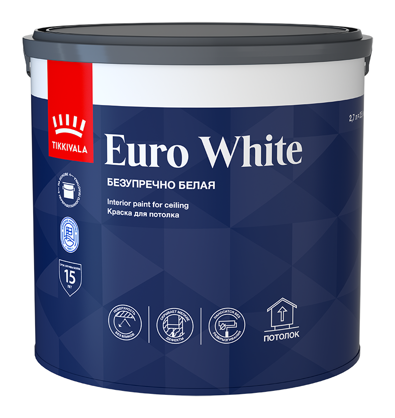 Краска для потолка EURO WHITE белая (гл/мат)  -  Совершенно матовая краска для потолков. Идеально скрывает небольшие дефекты, придает матовой поверхности яркость и безупречную белизну от бренда Tikkurila с доставкой по России!