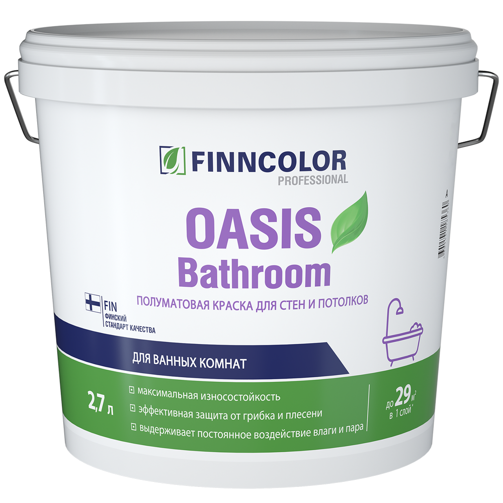 Краска для влаж. помещений OASIS BATHROOM п/мат  -  Высококачественная интерьерная краска. Образует полуматовое влагостойкое покрытие, содержит добавки против плесени, обладает наивысшим классом стойкости к мытью от бренда Finncolor с доставкой по России!