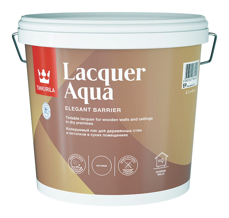 Лак панельный интерьерный LACQUER AQUA (матовый)  -  Лак панельный интерьерный Tikkurila LACQUER AQUA Tikkurila LACQUER AQUA — это высококачественный акрилатный лак на водной основе, разработанный специально для интерьерных работ. Этот защитно-декоративный лак идеально подходит для обработки деревянных поверхностей, обеспечивая их долговечность и эстетический вид. Благодаря своей быстросохнущей формуле, он позволяет значительно сократить время на выполнение отделочных работ. Особенности ЛАКЕР АКВА: - Экологичность: лак полностью на водной основе, что делает его безопасным для окружающей среды и здоровья. - Без запаха: благодаря современным технологиям производства, лак не выделяет неприятных запахов, создавая комфортные условия во время работы. - Матовая фактура: создает мягкий и элегантный вид, идеально подходящий как для стен, так и для потолков. - Защита от грибка и плесени: специальные добавки обеспечивают надежную защиту поверхности от биологического поражения. - Колеруется: легко подбирается под любые дизайнерские решения благодаря широкому спектру доступных оттенков. Tikkurila LACQUER AQUA — идеальный выбор для создания уютного и здорового интерьера, где важна безопасность и качество материалов. от бренда Tikkurila с доставкой по России!