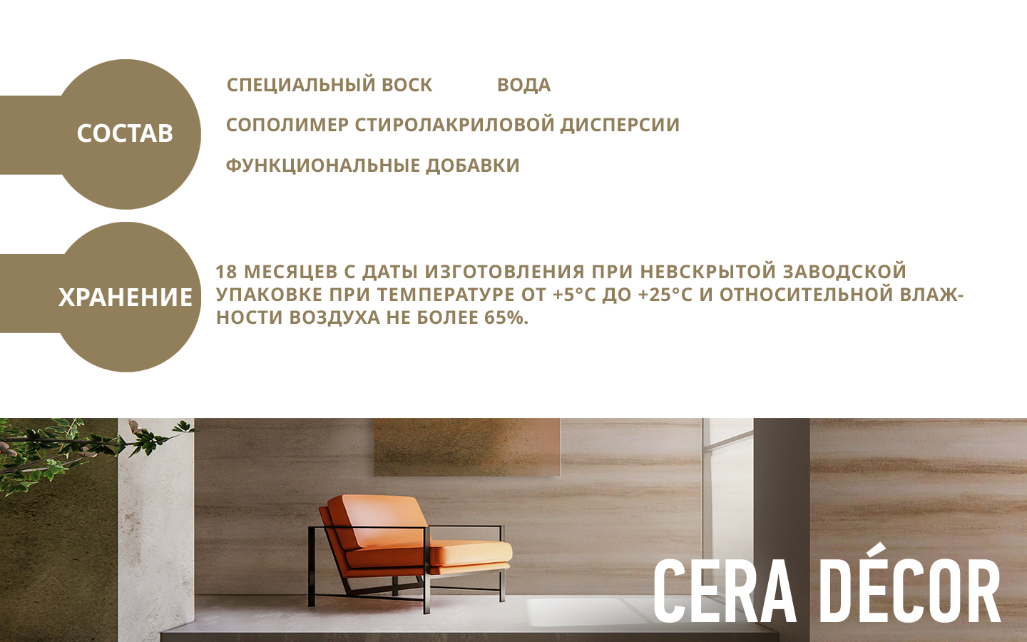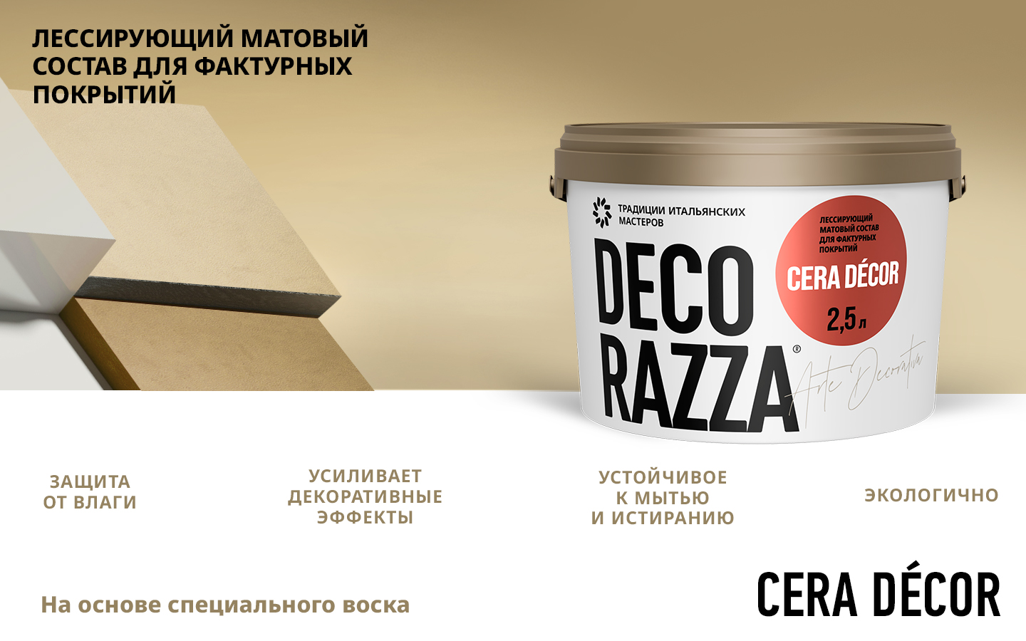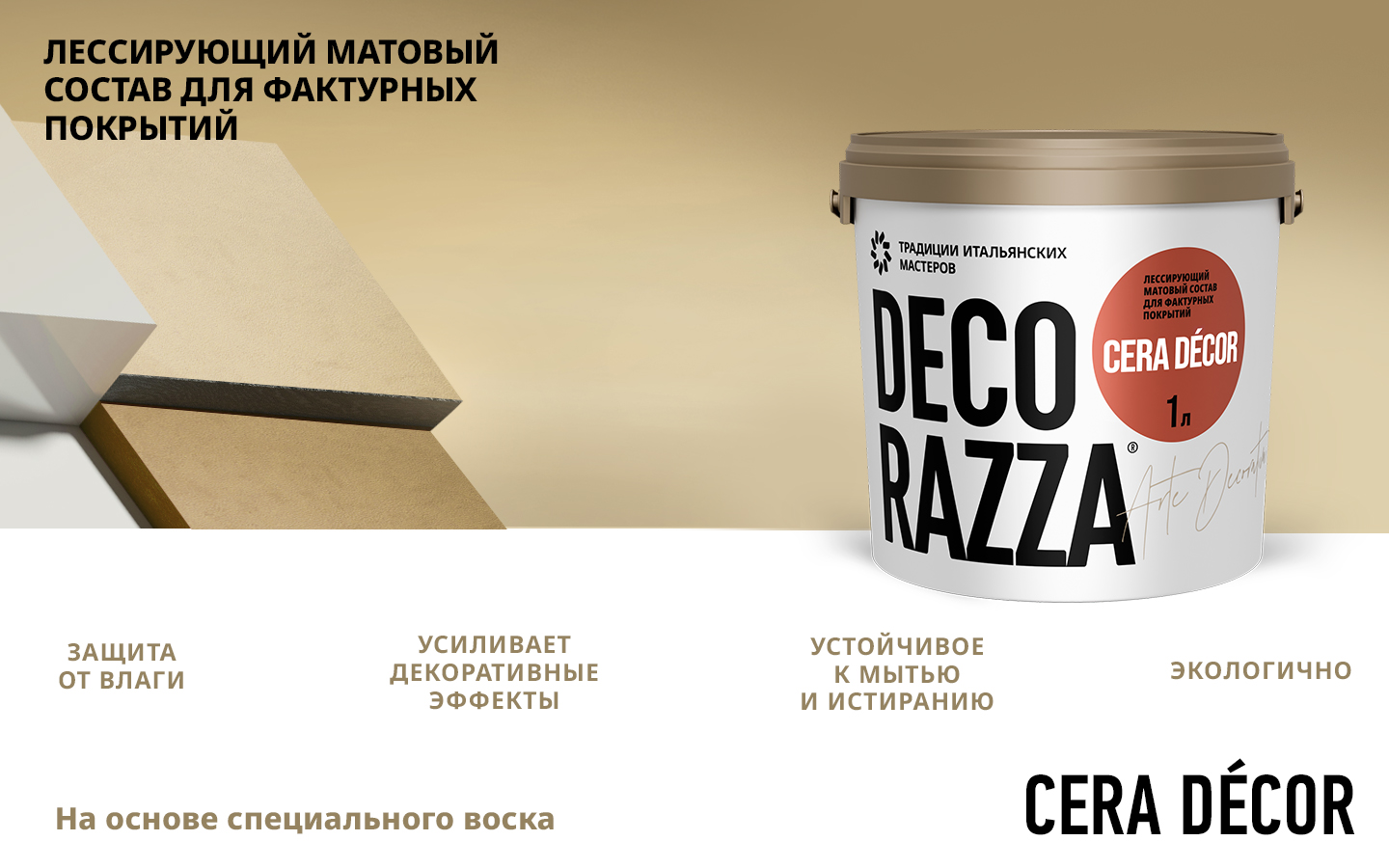 на основе воска позволяет придать особую выразительность декоративным штукатуркам под дерево, натуральный мрамор, металл, ткань и продуктам с имитацией других материалов. Лессировка используется для улучшения эстетических и эксплуатационных характеристик декоративных материалов. Продукт производится прозрачным, но может колероваться в разные оттенки по каталогу, усиливая или слегка приглушая за счет матовости яркость цвета основного покрытия. После обработки защитным составом Cera Decor поверхность становится устойчивее к влаге, истиранию, а загрязнения можно удалять влажной салфеткой без риска повреждения покрытия. Среди популярных эффектов, создаваемых с использованием этого материала, декоры «Кора», «Прованс», «Шале», «Травертин» и другие.