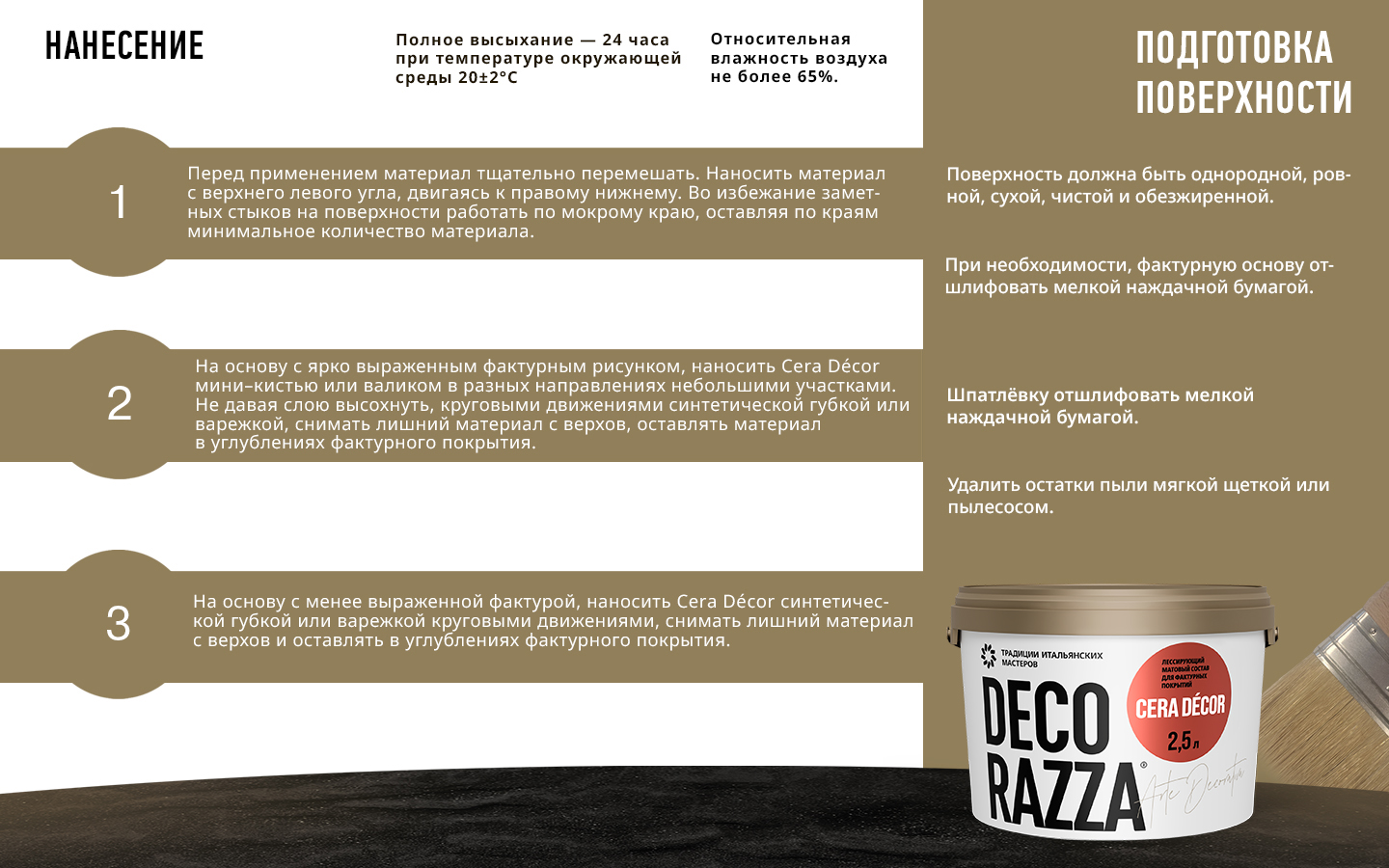 Поверхность должна быть прочной, чистой, сухой и обезжиренной. При необходимости, фактурную основу отшлифовать мелкой наждачной бумагой. Удалить остатки пыли мягкой щеткой или пылесосом.
