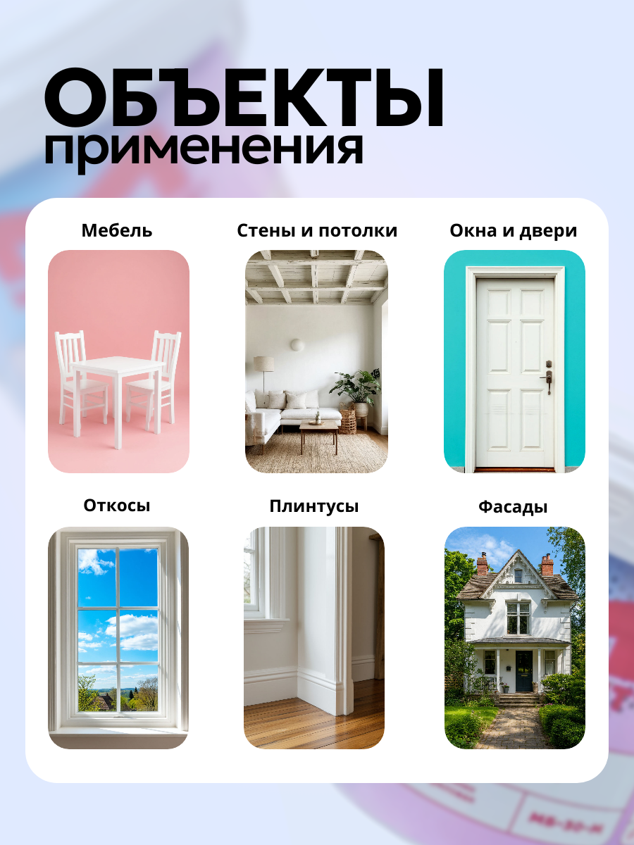 Предназначена для окраски различных поверхностей внутри и снаружи зданий и сооружений.