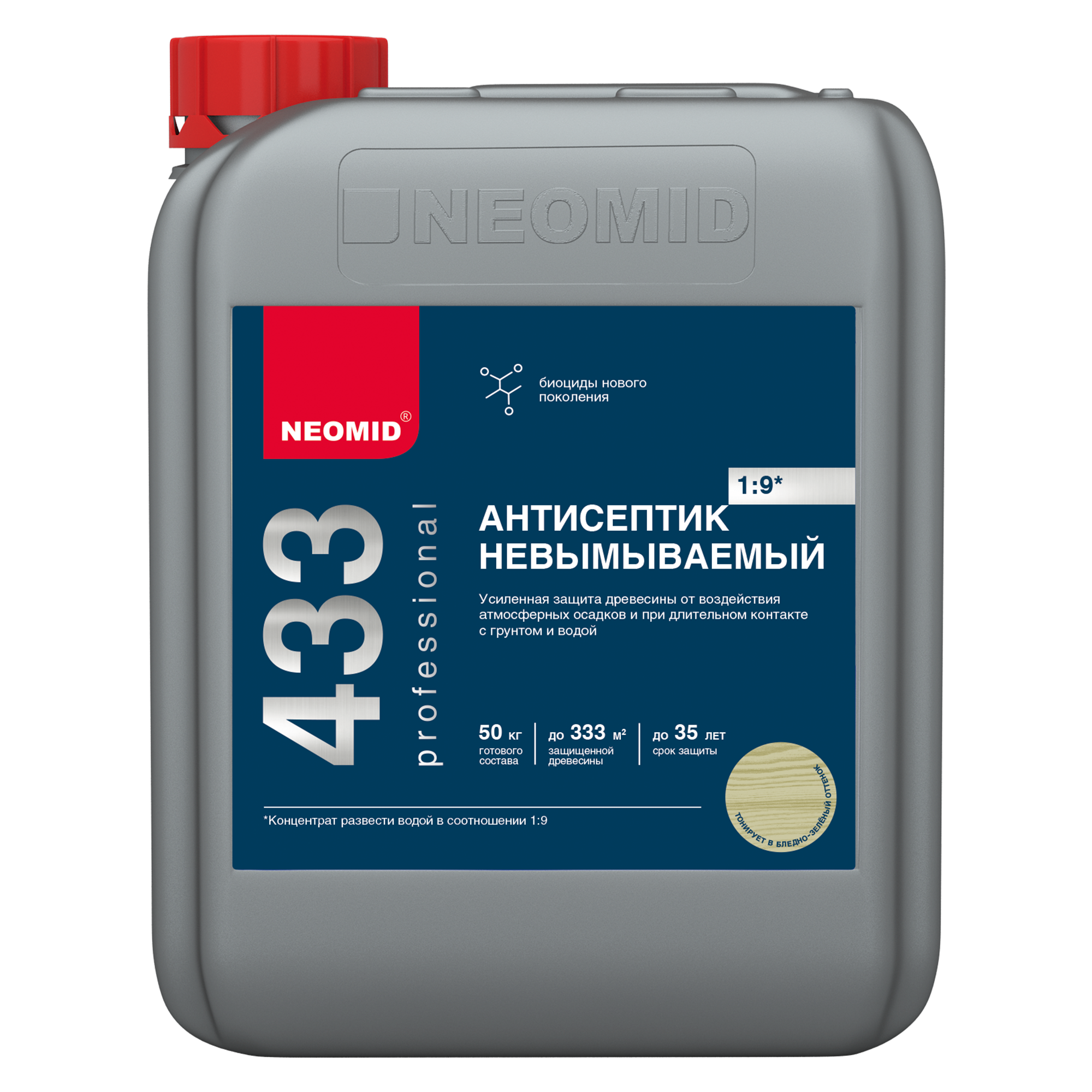 NEOMID 433 невымываемый усиленный антисептик - Антисептик невымываемый. Обеспечивает максимальную защиту древесины, в том числе при длительном контакте с грунтом и влагой от бренда Neomid с доставкой по России!