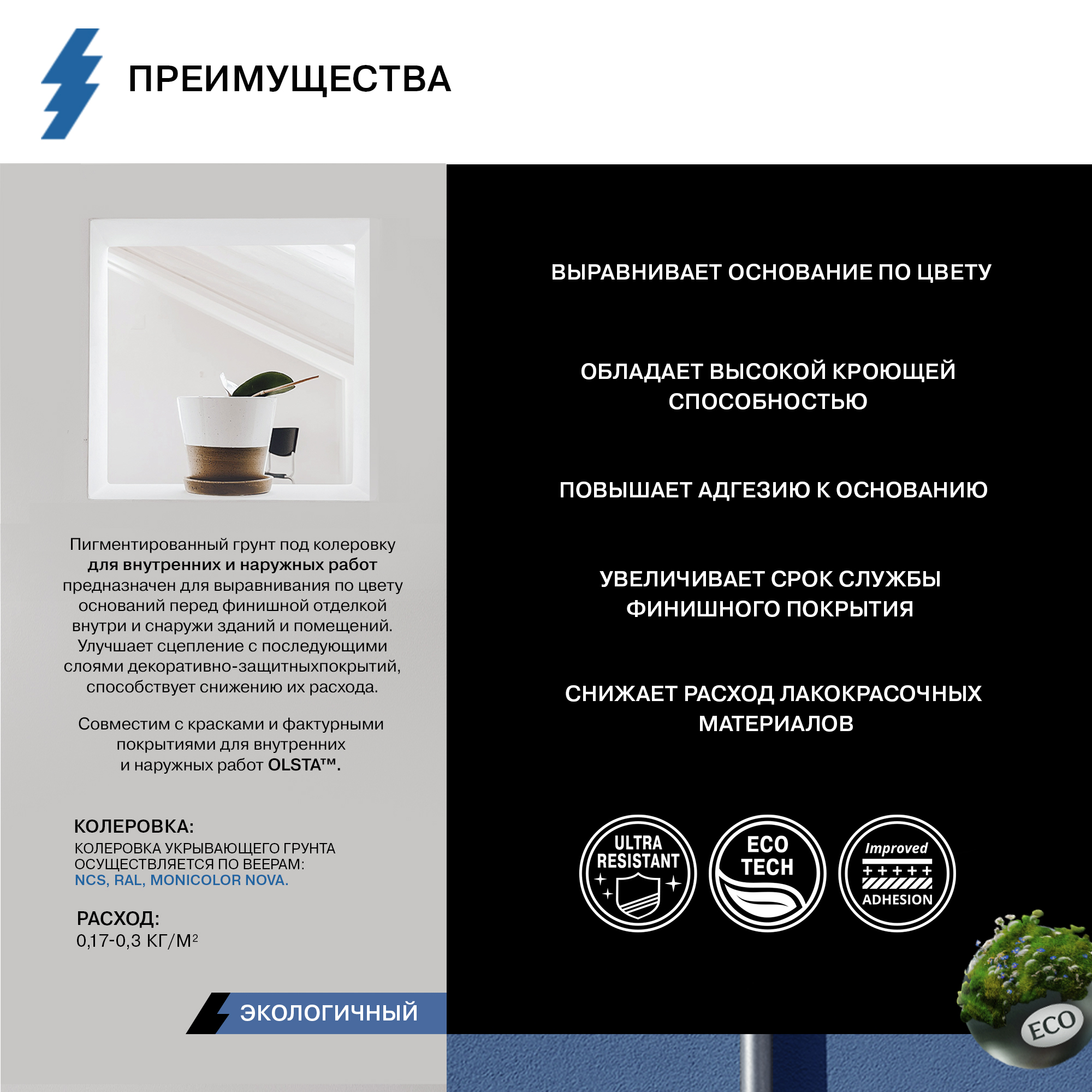 Укрывающий грунт Olsta Pigmented primer для цветового выравнивания обеспечивает качественную финишную отделку фасадов и интерьеров. Пигментированный материал хорошо укрывает основание, не оставляя темных пятен, снижает расход отделочных материалов, повышает качество сцепления с декоративными покрытиями.
